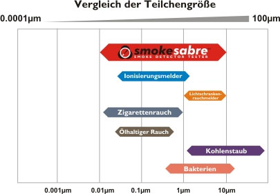 Smoke Sabre ist ein universelles Prüfprodukt für den Empfindlichkeitsbereich aller Rauchmelder (siehe Vergleichstabelle für Teilchengröße).